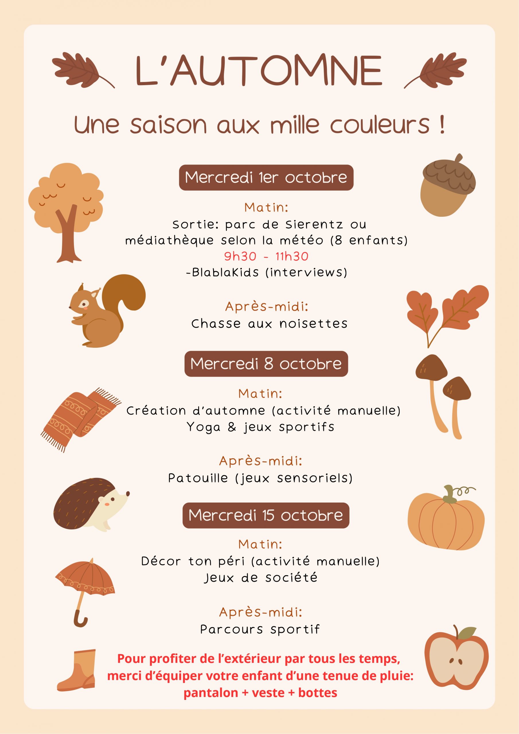Les vacances de la Toussaint pour les enfants de 3 à 6 ans de Bartenheim et environs se déroulent à...
